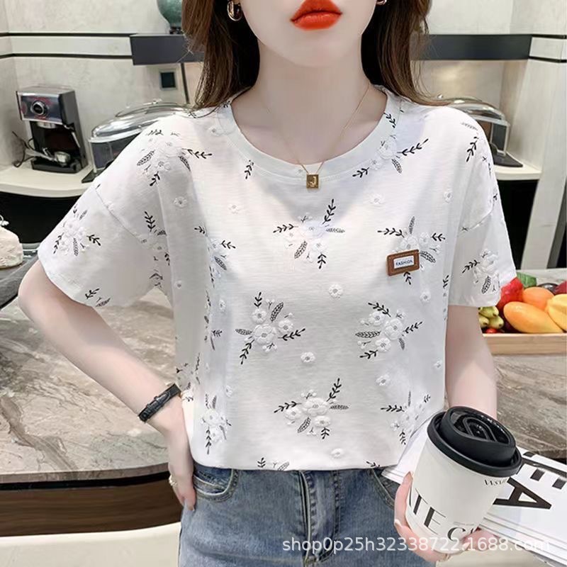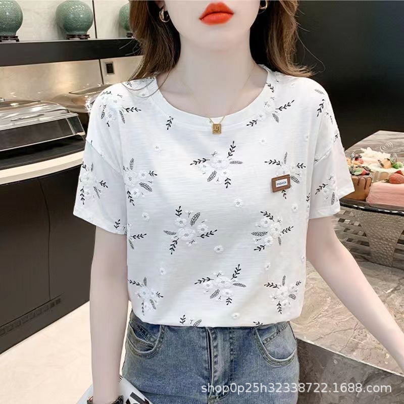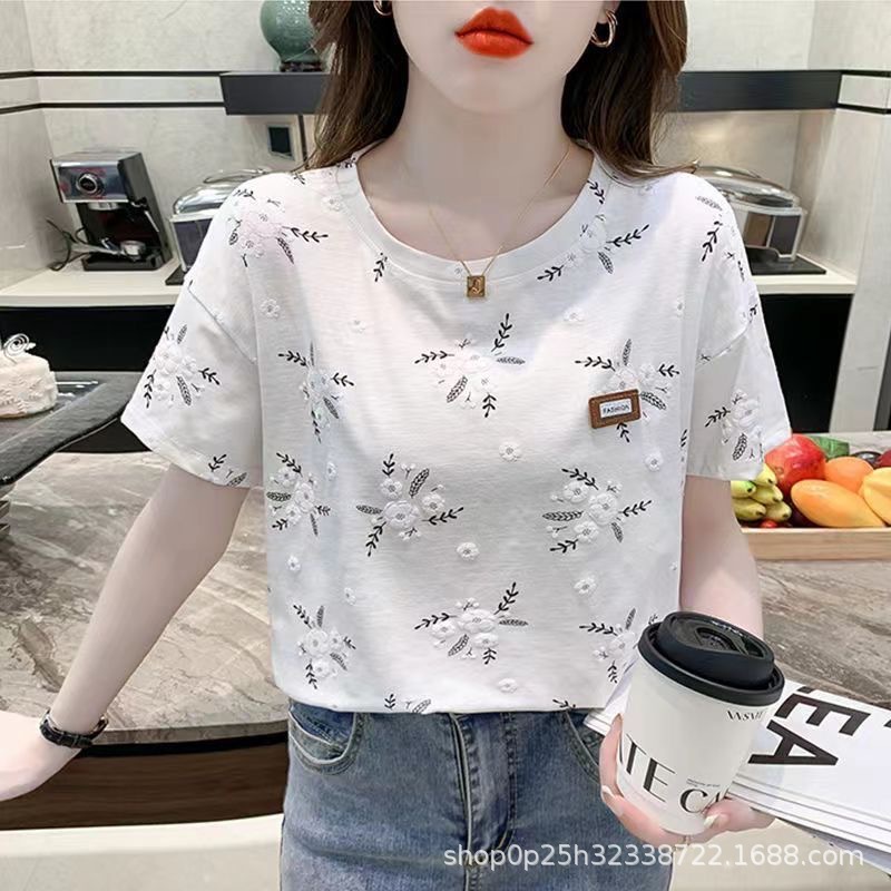 short sleeve t-shirt women’s white 2024 new korean version loose crew neck ins tide creative half-sleeved inner top tide