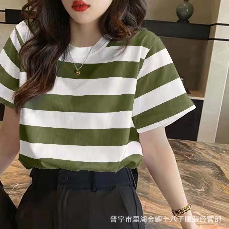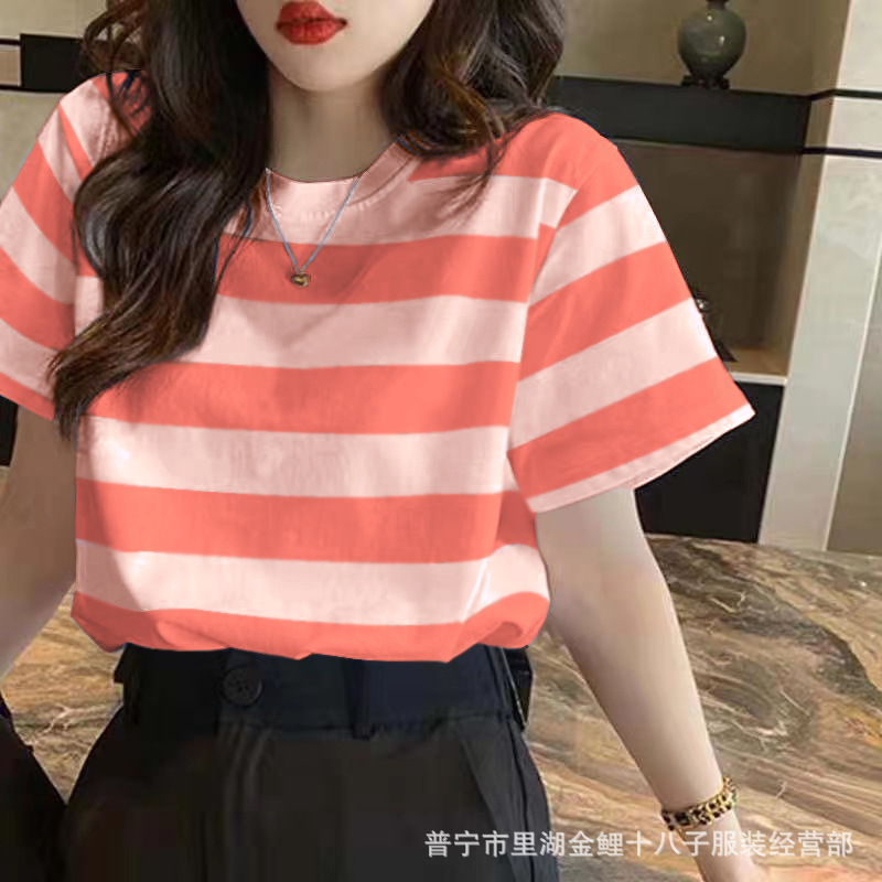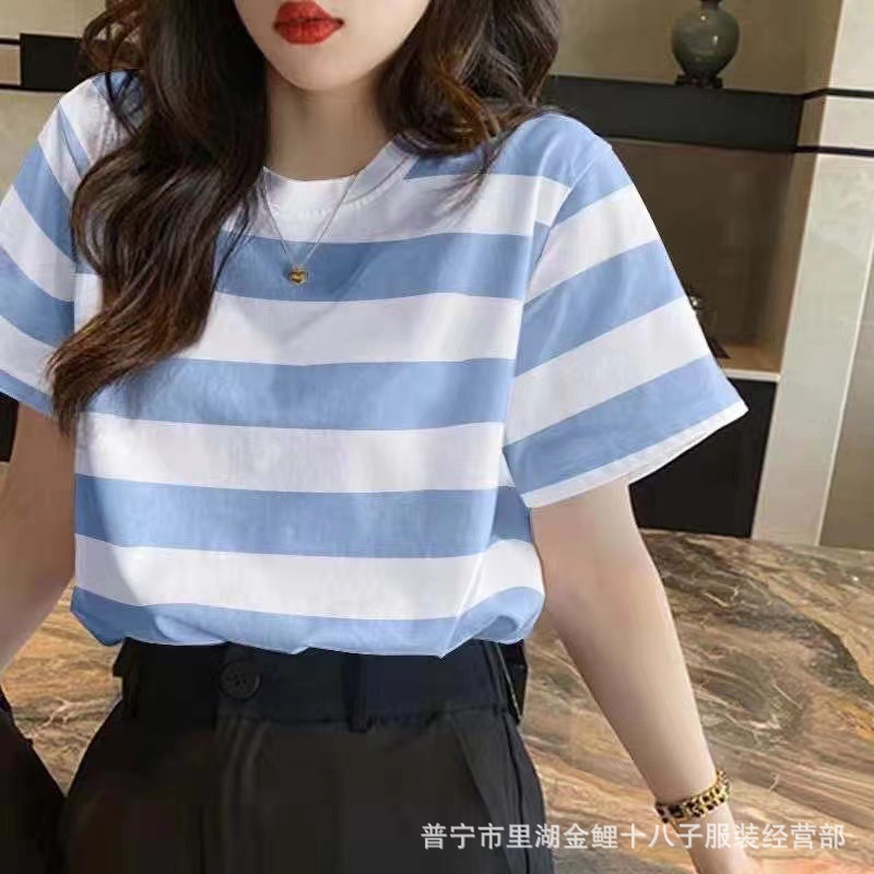 Striped short sleeve t-shirt women’s summer new round neck slim slim slim t-shirt with large shoulders casual and versatile