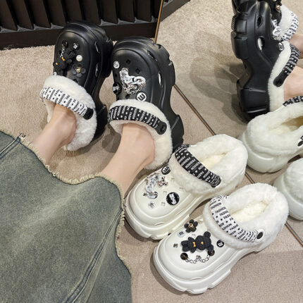 Cartoon cotton drag girl autumn and winter wear 2024 new thick-soled height-resistant non-slip two-wear fleece warm hairy hole shoes