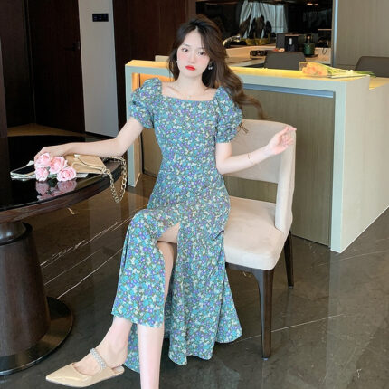 French square neck puff sleeve floral midi dress women’s summer 2024 new waist slit A-line skirt tide