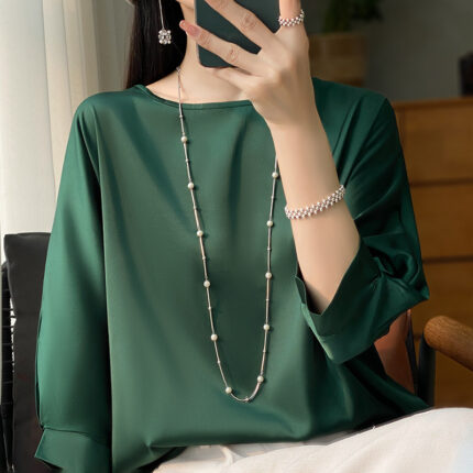 Silk satin spring summer 2024 women’s new round neck loose temperament T-shirt three-quarter sleeve solid color simple and versatile top